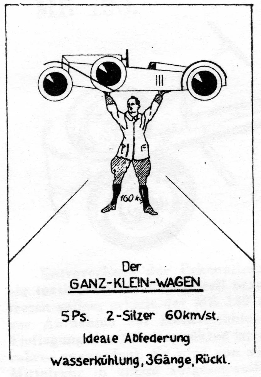As a student, Josef Ganz became inspired by the idea to build a people's car, or volkswagen, for the price of a motorcycle. In 1923 he made his first sketches for a small, lightweight, 4-wheeled car with a mid-mounted engine, independent all-round suspension, and a streamlined body. The design was inspired by the revolutionary Rumpler Tropfenwagen from 1921.