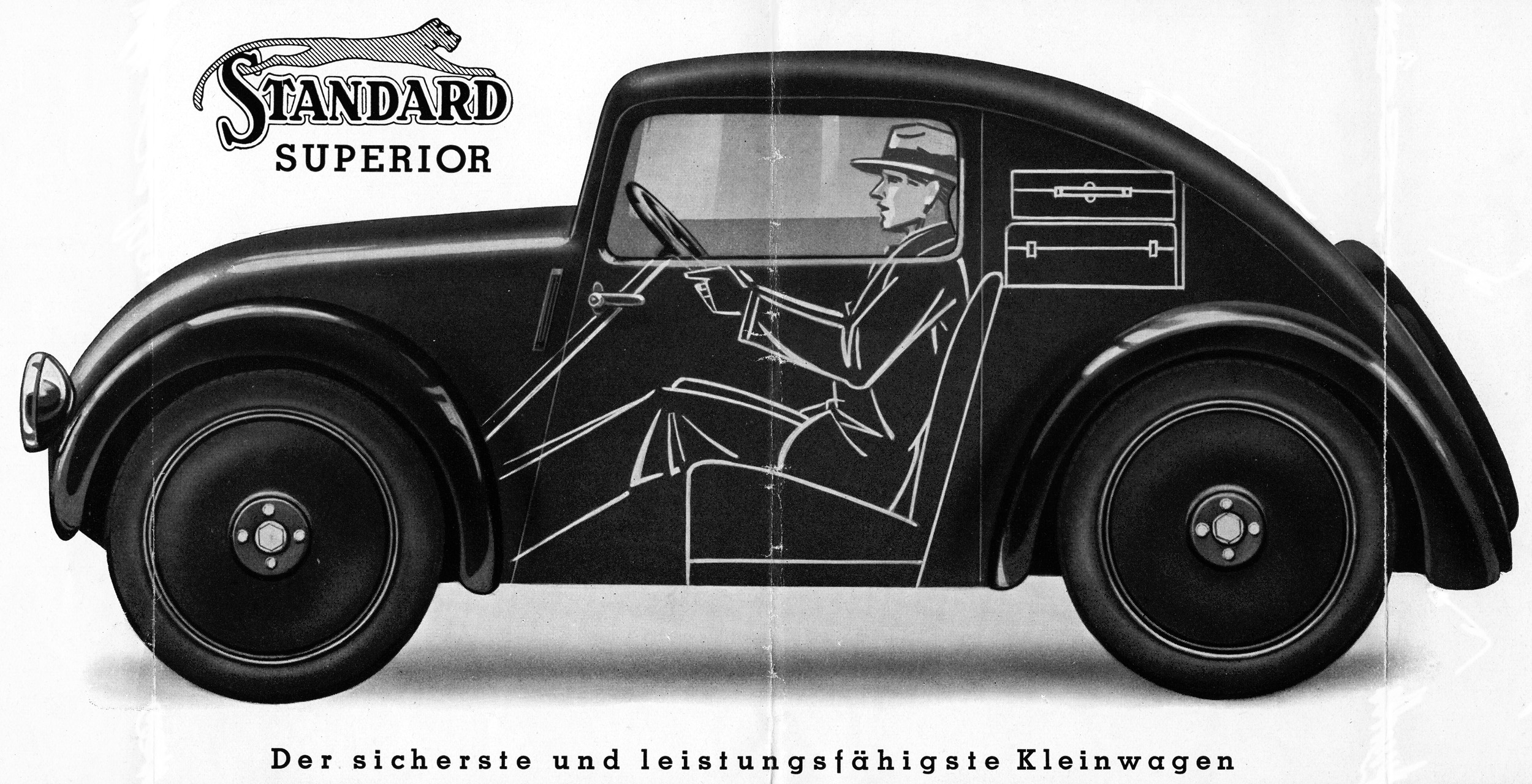 The Standard Superior is the embodiment of Josef Ganz‘s propaganda campaign «For the German Volkswagen». As editor-in-chief of Motor-Kritik magazine, in the period 1928-1933, he outlined the specifications for this future car: low-slung, streamlined, backbone chassis, rear-mounted engine, fully independent suspension with swing axles and a price not exceeding 1,000 Reichsmark.