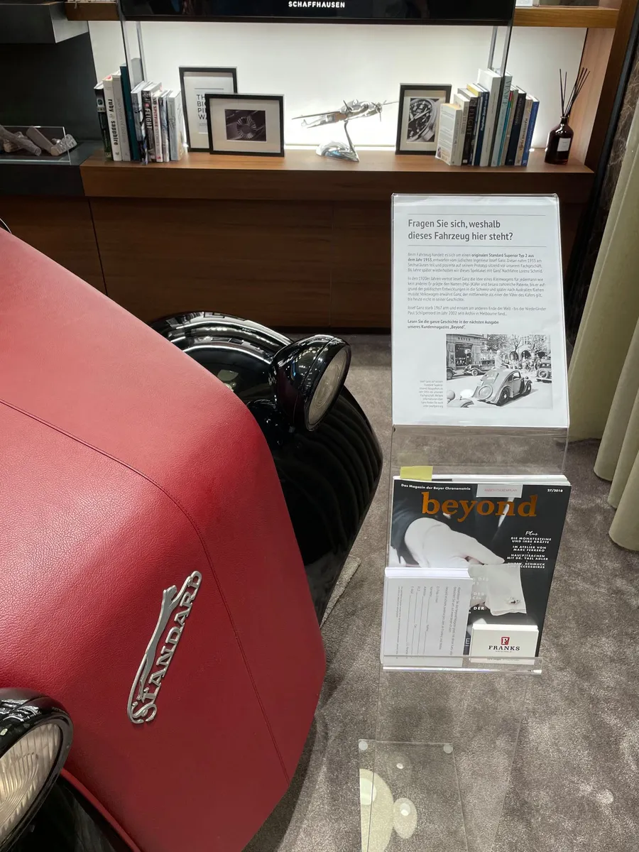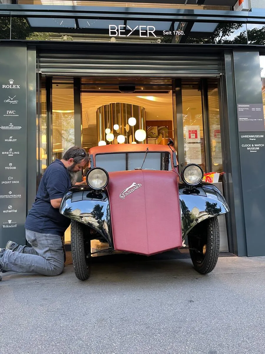 On 24/25 September 2021, the time had come for the road trip with the restored and registered Standard Superior Type 2 from 1933: I drove from the garage “Frank’s Originale” in Kriens, Lucerne, to the Bahnhofstrasse in Zurich. In front of the oldest watch shop in Switzerland, Beyer Chronometrie, where Josef Ganz sat on the roof of his Superior in 1936, we repeated the spectacle. A dream came true! To sit on the same model more than 80 years later, in exactly the same place, and thus recreate the image – simply incredible!