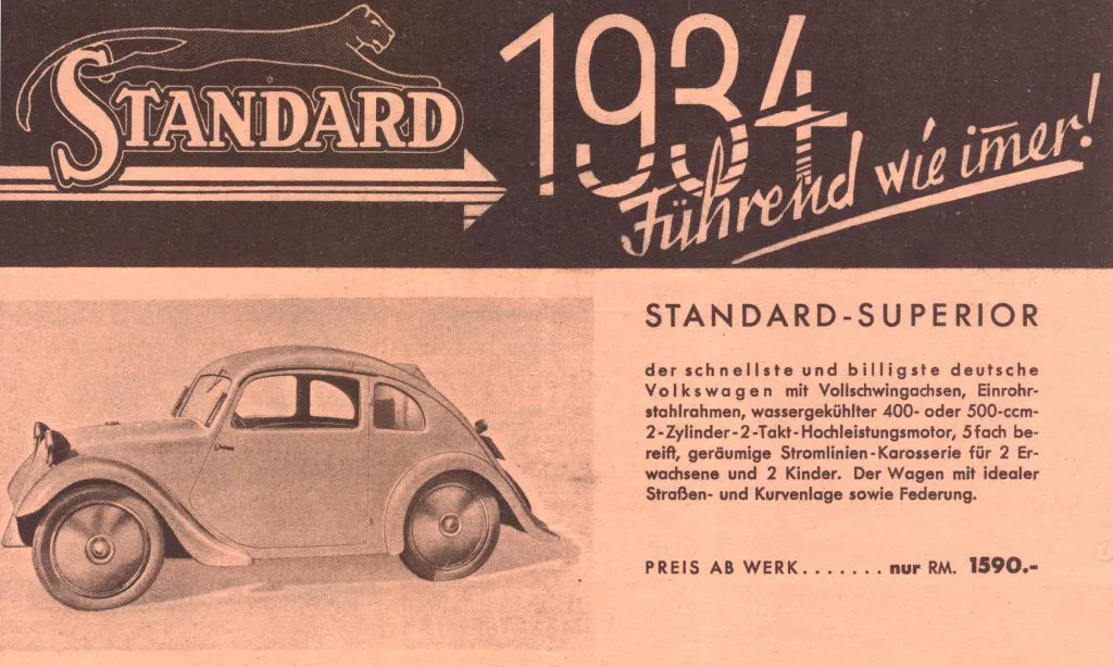 In September 1933, the Standard Fahrzeugfabrik introduced an updated model with a longer wheelbase, different bodywork with an extra side window on either side, and a larger children's seat in the rear. It was advertised as 'the cheapest and fastest German Volkswagen'. After Hitler had committed himself to the Volkswagen project in mid-1934, Standard and all other car builders were forbidden to use the name Volkswagen in their advertising.